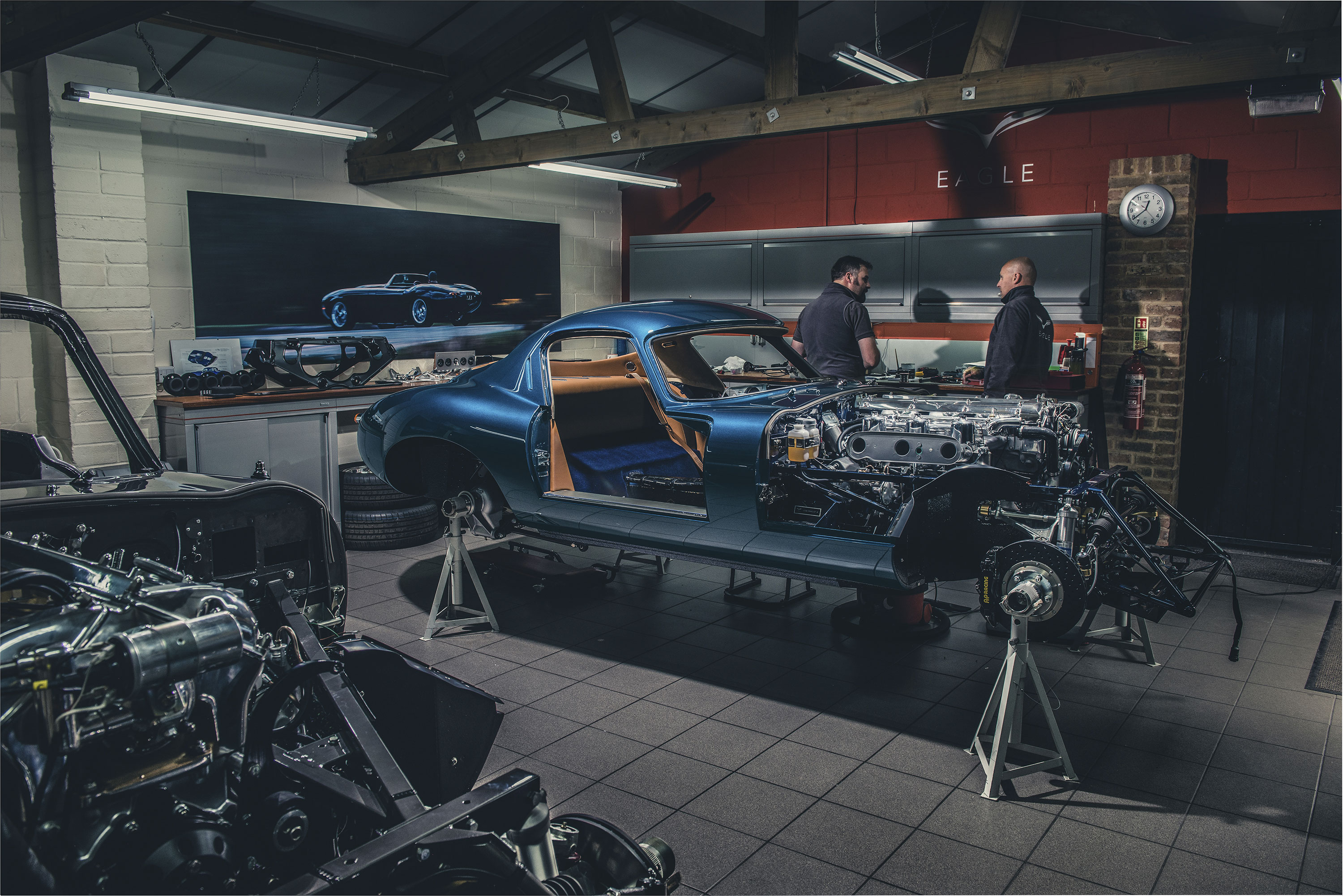How many parts make up an Eagle E-type? No one’s quite sure, but they’re all here, neatly laid out on racks, sitting in jigs, waiting on shelves or benches, ready to be carefully, diligently connected each to the other: valve springs, washers, sheets of aluminium, steering arms, wires. And if they’re not here already, they’re probably in the process of being created behind another door in the pristine yard of this tucked away farm.