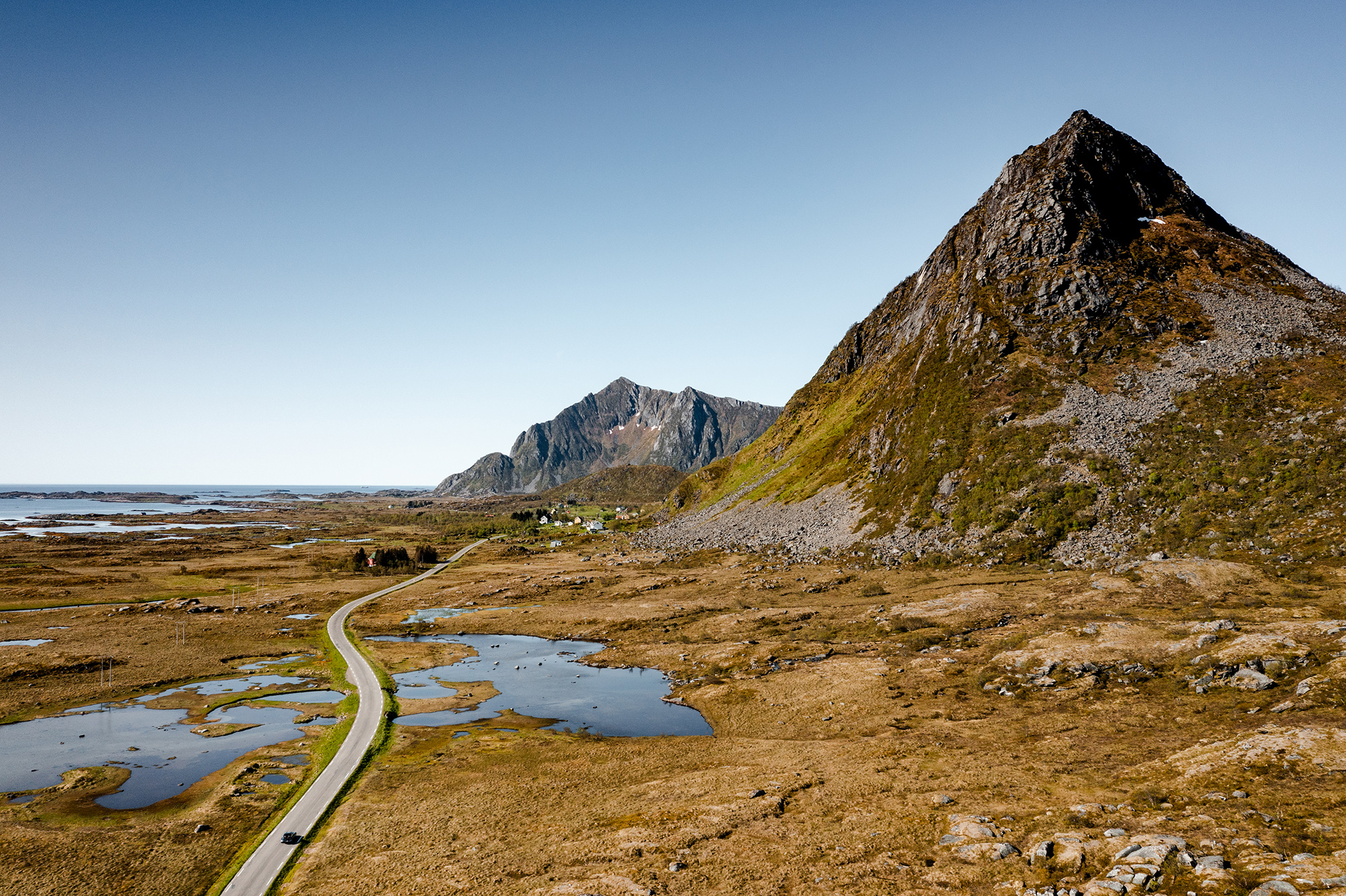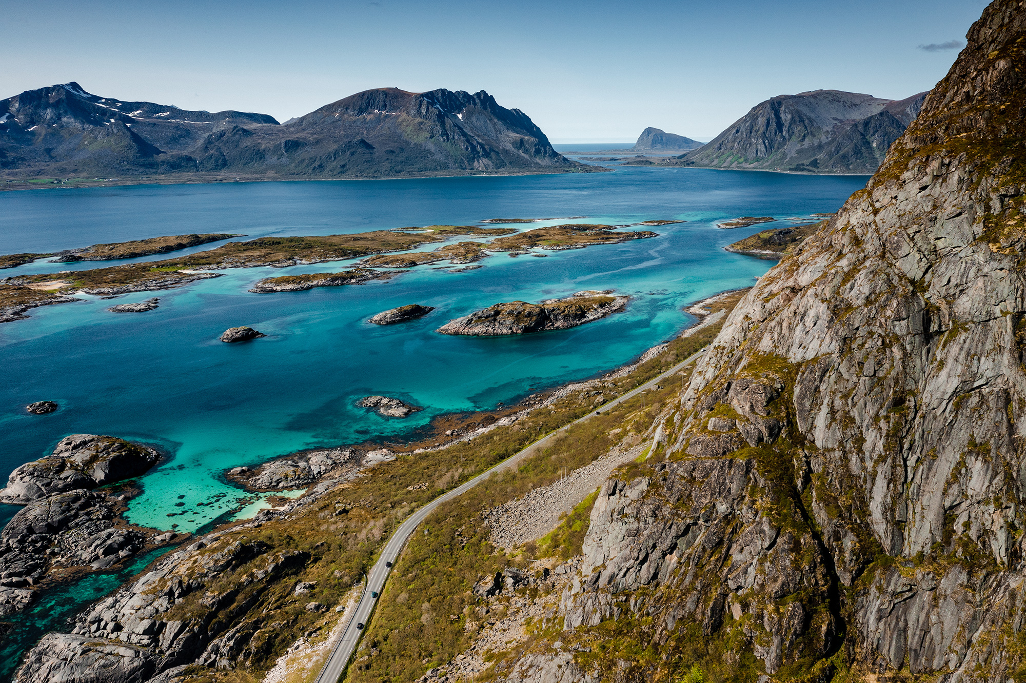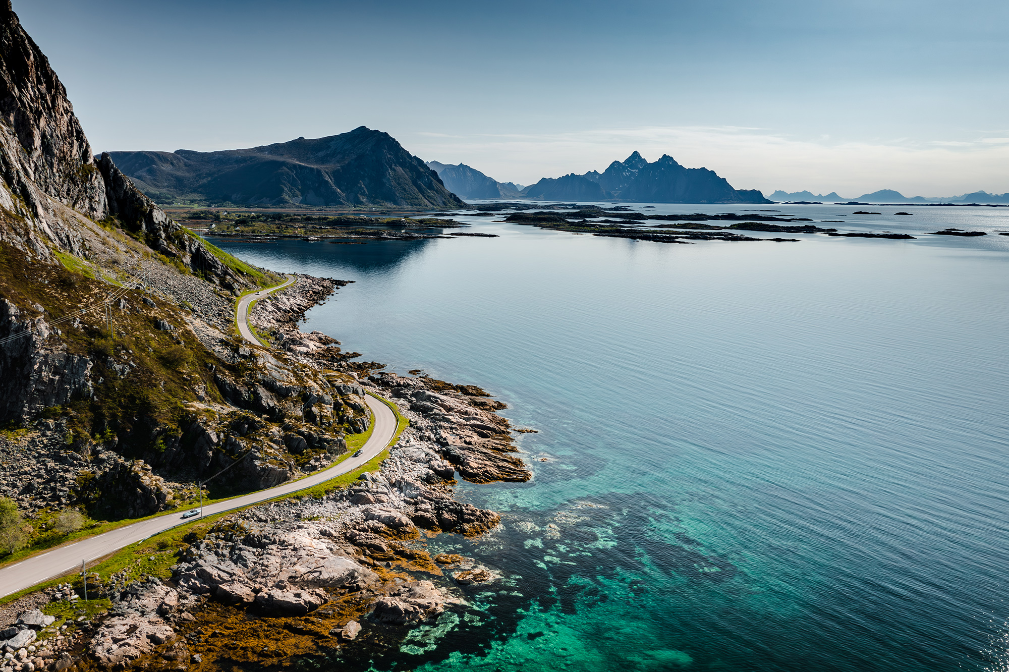 Day three saw a longer but incredibly scenic drive of 350km. The first part of the day ran along green valley floors, surrounded by high, barren mountains. Then we hit the coast and headed towards the Lofoten Islands, nestled close to the mainland, but with a topography all of their own. Set on a group of tiny islands at the foot of the imposing Vagakallen mountain is the charming fishing village of Henningsvær, our home for two nights.